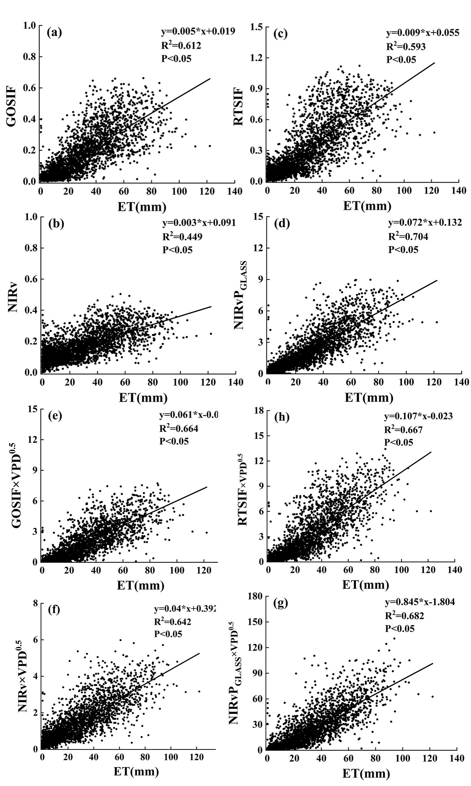 最近开发的近红外反射指数(NIRv)已被证明与植被光合作用密切相关,并且还具有估算总初级生产力(GPP)的潜力。NIRv和光合有效辐射(PAR)的乘积NIRvP已被证明是植被光合作用的更稳健指标,并且通过比较,NIRvP和GPP之间的关系可能优于日光诱导叶绿素荧光(SIF)。此外,植被光合作用、代谢过程、气孔导度和蒸腾作用在一定程度上是耦合的。因此,这些新开发的指数在估算ET或ETo方面也具有很大的潜力。因此,比较和识别更有利的遥感指标对于准确的ET或ETo估算具有重要意义。